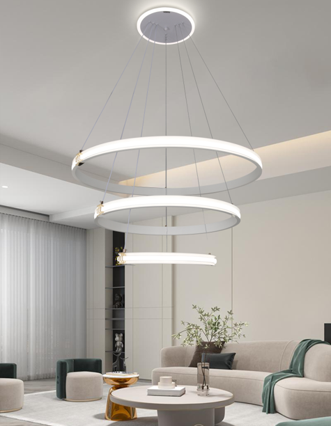 This lamp has a modern and artistic design. It features two curved metal strips that twist and loop around each other, creating a unique shape. A cylindrical light hangs in the center, covered by a mesh-like material. It is suspended from the ceiling with thin wires, making it look light and elegant. The lamp combines function with a decorative, sculptural style.